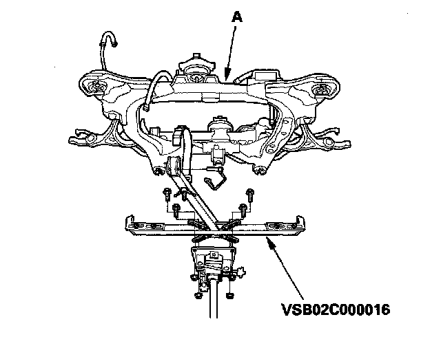 17. Support the front subframe (A) with the special tool and a jack, and lift it up to body.