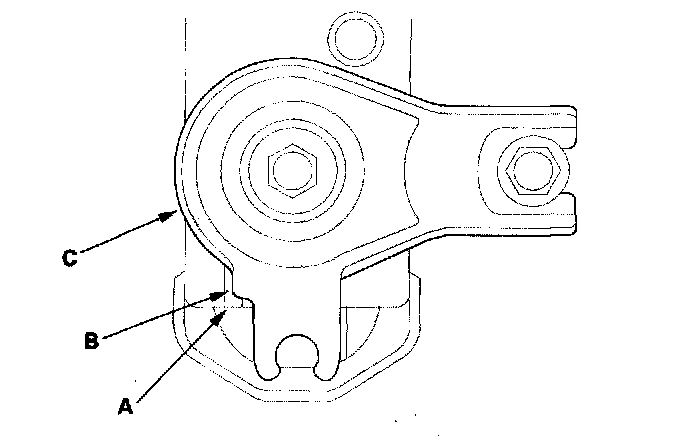 20. Align the reference marks (A) with edge (B) of both rear stiffeners (C), and tighten the rear subframe mounting bolts, then front bolts, and tighten the stiffener bolts to the specified torque.