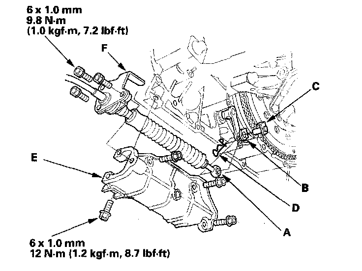24. Install the shift cable cover (E), then secure the shift cable holder (F) to the shift cable cover with the three bolts.