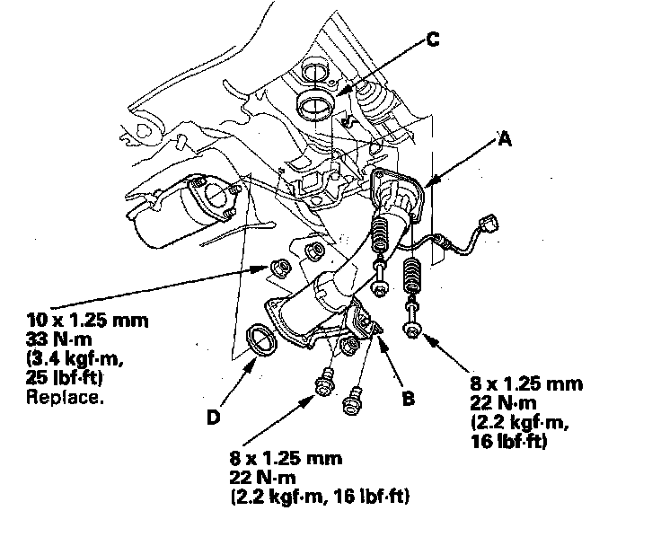28. Install the exhaust pipe A, its mount (B), and new gaskets (C) (D).