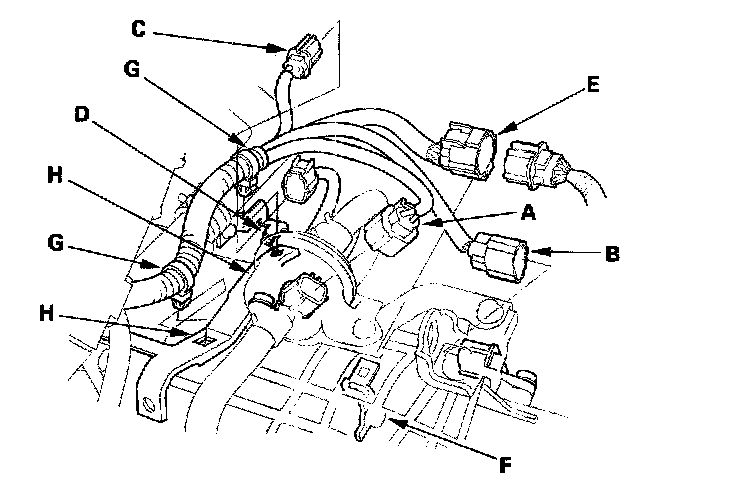 46. Connect the transmission range switch connector (E), then install it on its bracket (F).
