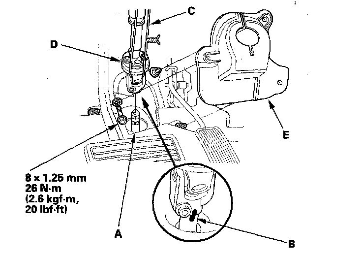 23. Attach the shift cable end (A) to the selector control lever (B), then insert the control pin (C) into the control lever hole through the shift cable end, and secure the control pin with the spring clip (D). Do not bend the shift cable excessively.