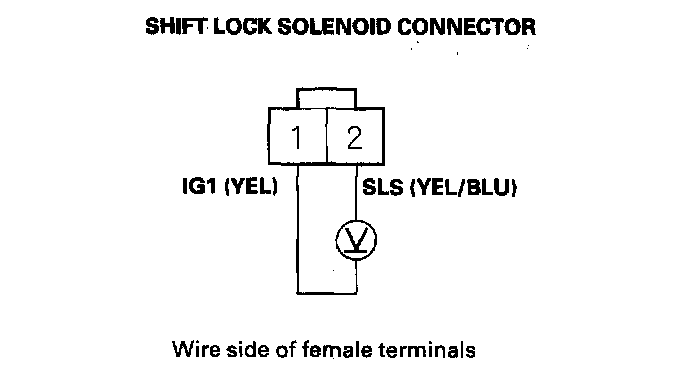 8. Measure the voltage between shift lock solenoid connector terminals No. 1 and No. 2 while pressing the brake pedal.
