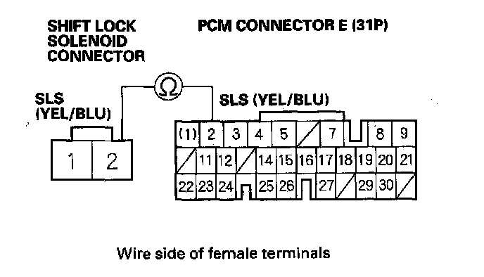 13. Check for continuity between PCM connector terminal E2 and shift lock solenoid connector terminal No. 2.