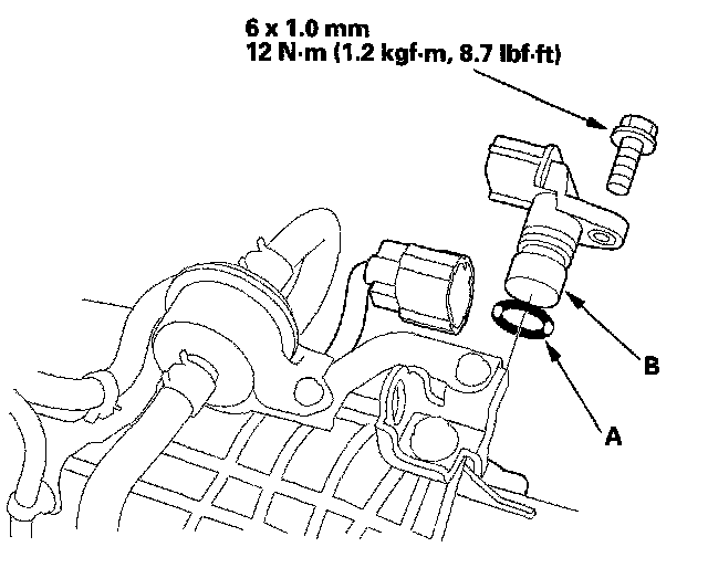 3. Install the new O-ring (A) on the new input shaft (mainshaft) speed sensor (B), then install the input shaft (mainshaft) speed sensor in the transmission housing.