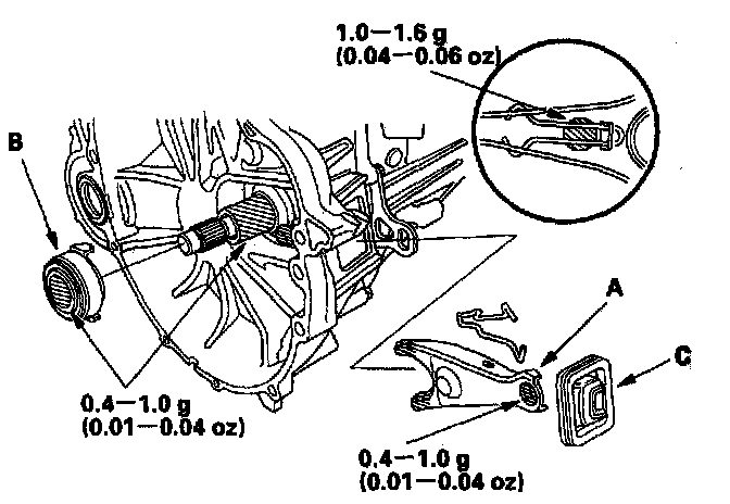 2. Apply super high temp urea grease (P/N 08798-9002) to the release fork (A) and the release bearing (B). Install the release fork, the release bearing, and the boot (C)
