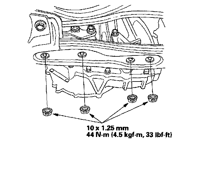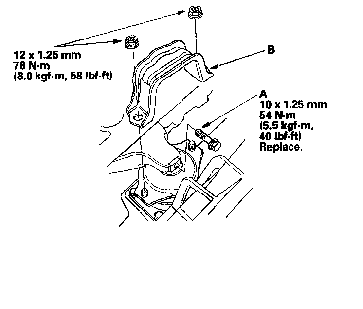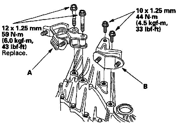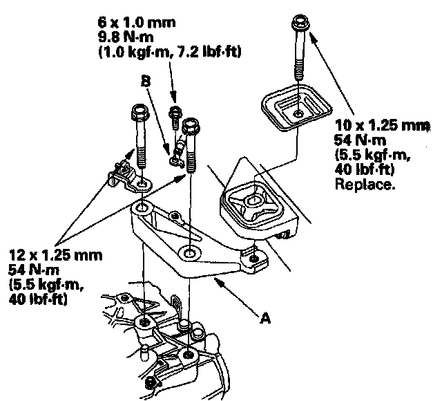 3. Install the transmission lower front mount (A) and transmission lower rear mount (B).