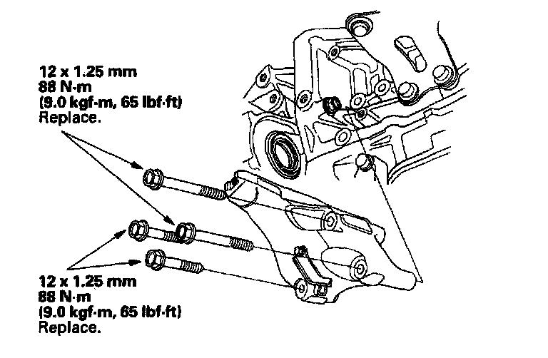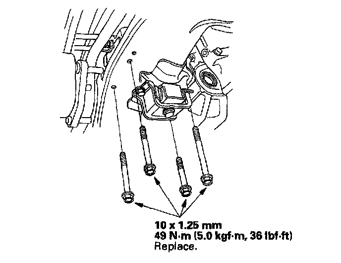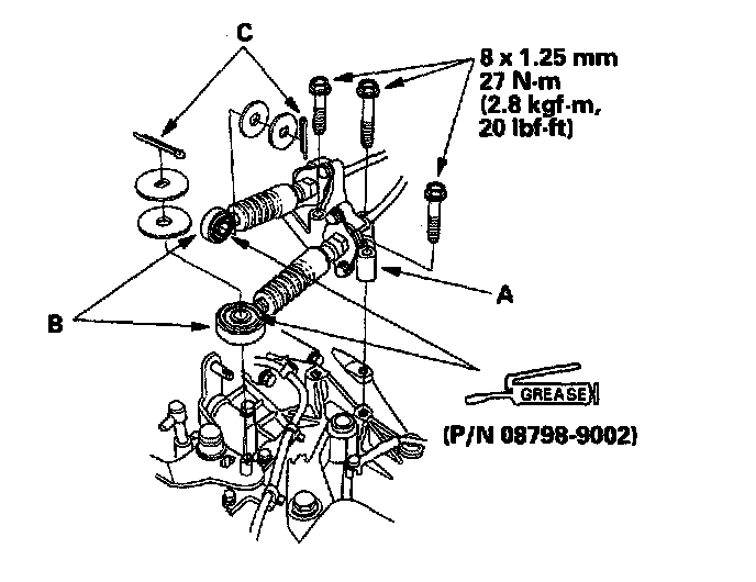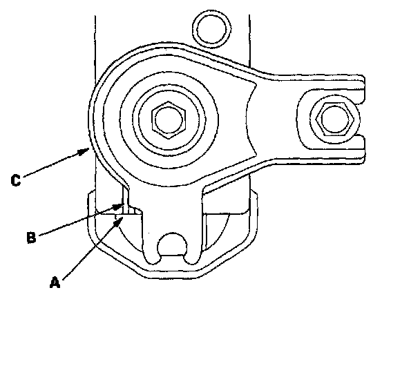 8. Install the rear engine mount (A), rear engine mount upper mounting bolt (B), and shift cable bracket (C).