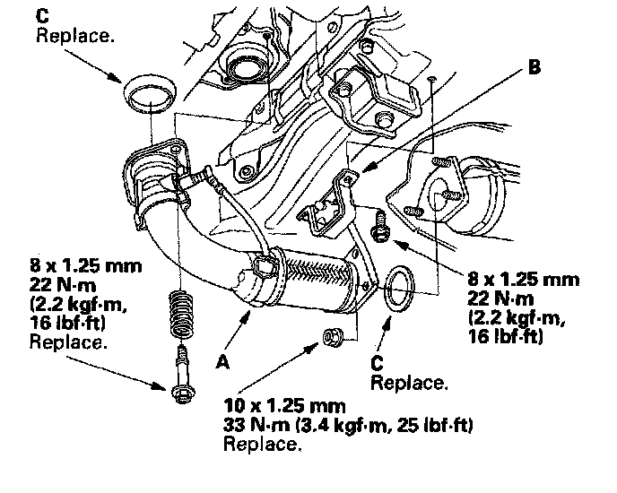 22. Install the exhaust pipe A, mount (B), and new gaskets (C).