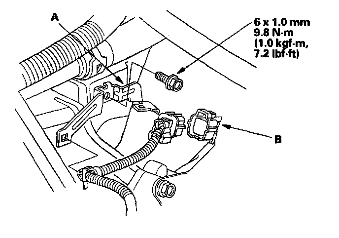40. Install the bracket (A), then connect the secondary heated oxygen sensor (secondary HO2S) connector (B).