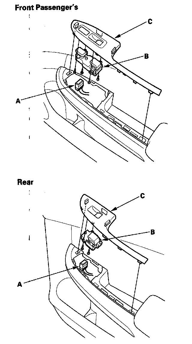 2. Disconnect the power window switch connector (A), then remove the three mounting screws and the power window switch (B) from the switch trim (C).
