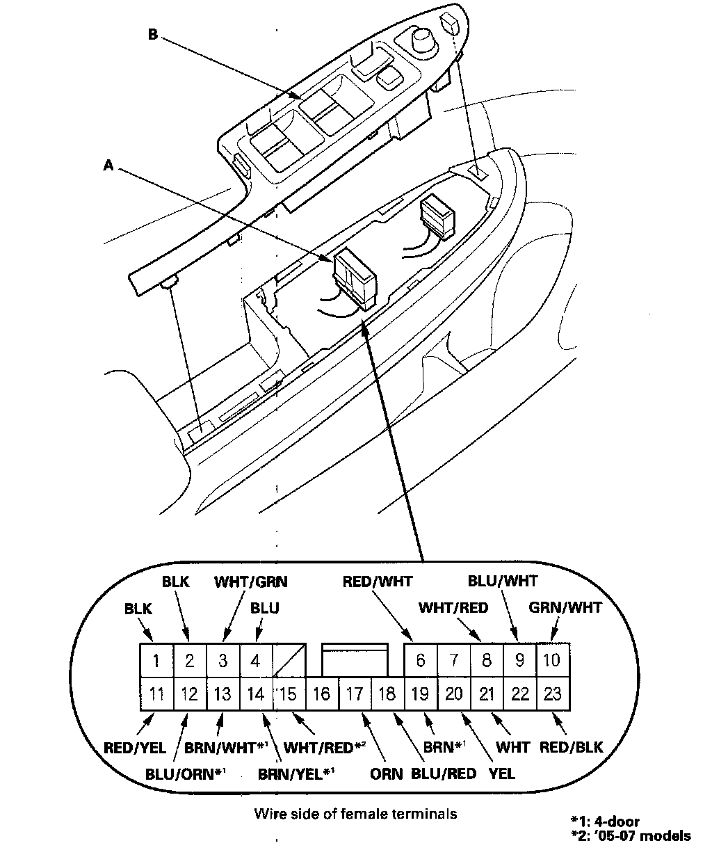 3. Disconnect the 23P connector (A) from the power window switch (B).