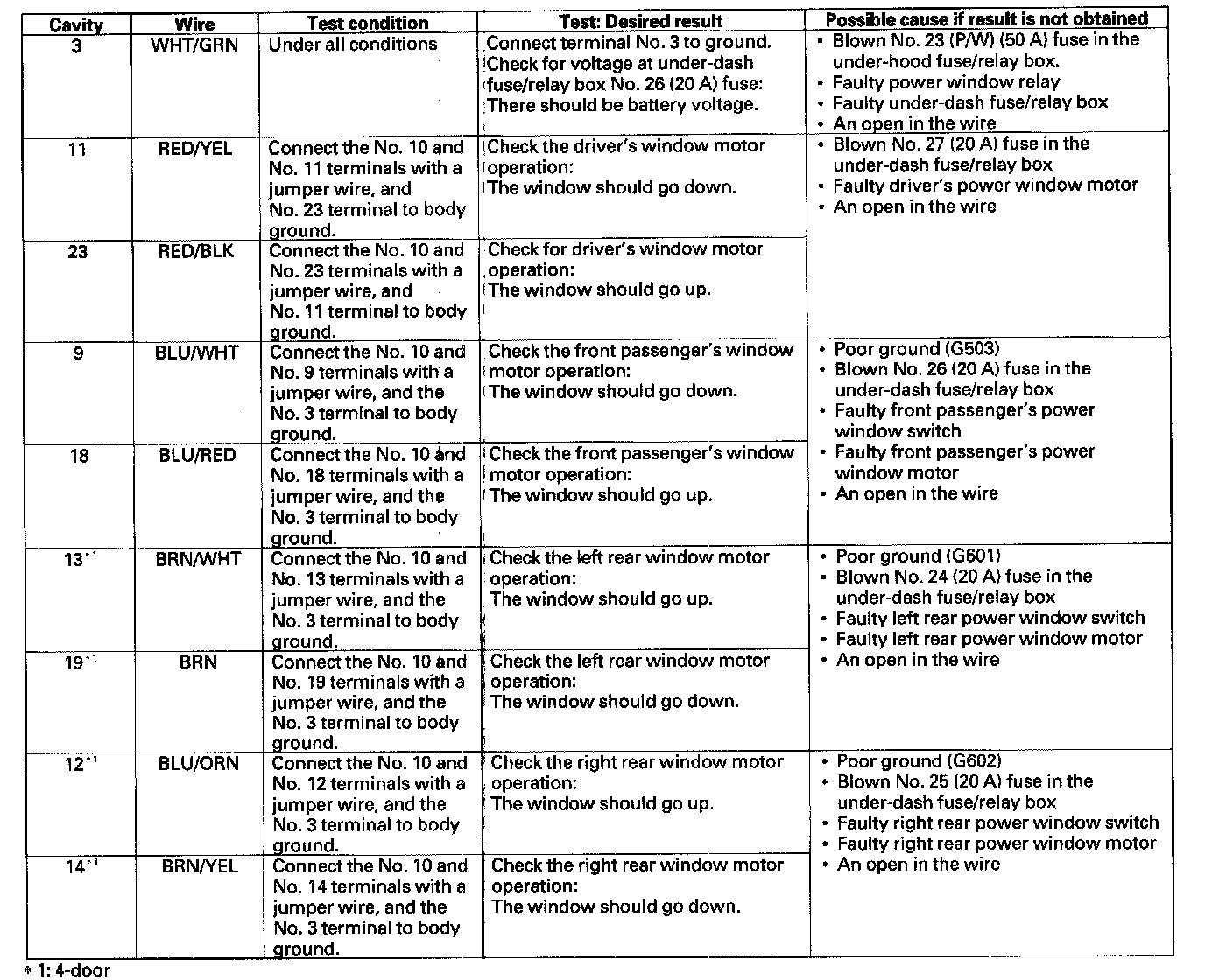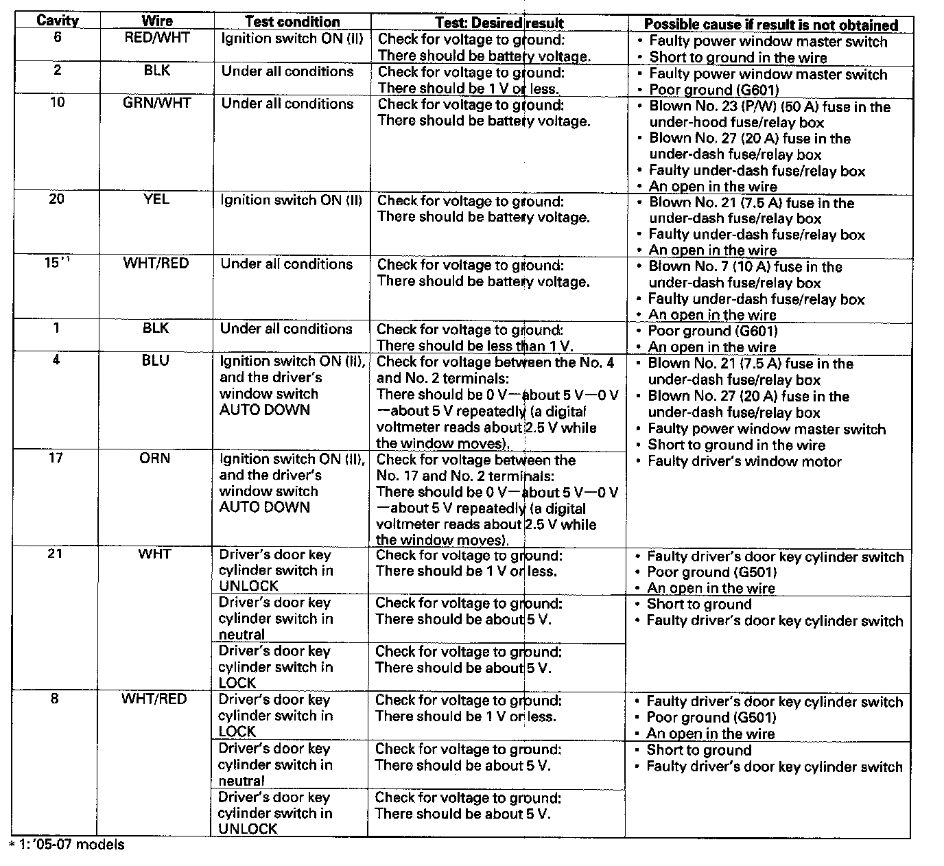 7. Disconnect the 22P connector from the power window master switch, and make these input tests at the connector.