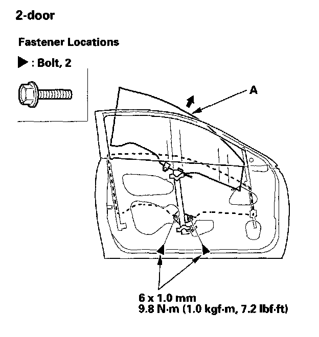4. Carefully raise the glass (A) until you can see the bolts, then remove them. Carefully pull the glass out through the window slot. Take care not to drop the glass inside the door.