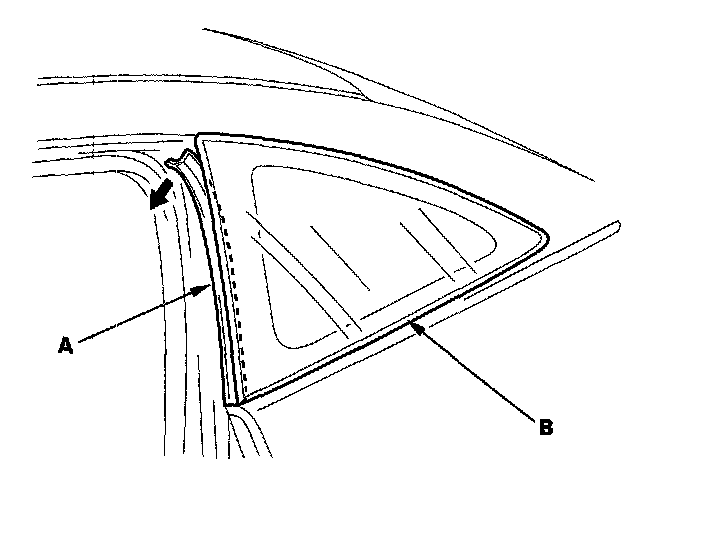 3. Remove the front seal (A) from the front edge of the quarter glass (B). If necessary, cut the front seal with a utility knife.