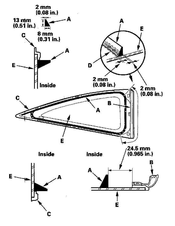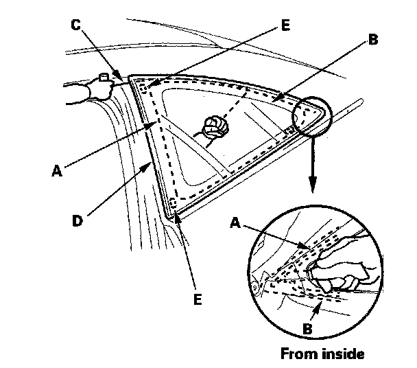 17. Pack adhesive into the cartridge without air pockets to ensure continuous delivery. Put the cartridge in a caulking gun, and run a bead of adhesive (A) around the edge of the front seal (B) and molding (C) as shown. With the glass primer (D) you applied in step 14 on the quarter glass (E) as a guide, apply the adhesive to the upper and lower corner portions of the quarter glass. Apply the adhesive within 30 minutes after applying the glass primer. Make a slightly thicker bead at each corner.