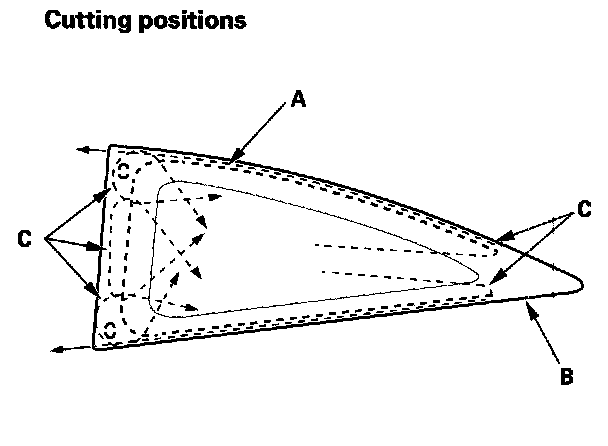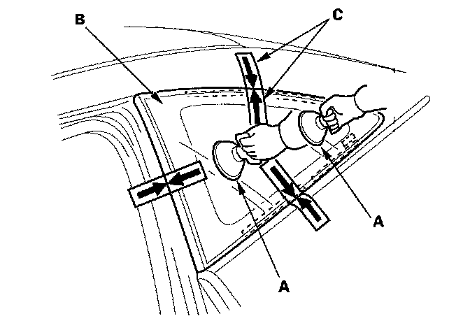 4. Carefully cut through the adhesive (A) at the rear corner portion of the quarter glass (B) with a utility knife. With a helper on the outside, pull the piano wire (C) back and forth in a sawing motion. Hold the piano wire as close to the quarter glass as possible to prevent damage to the body, and carefully cut through the adhesive around the entire quarter glass: