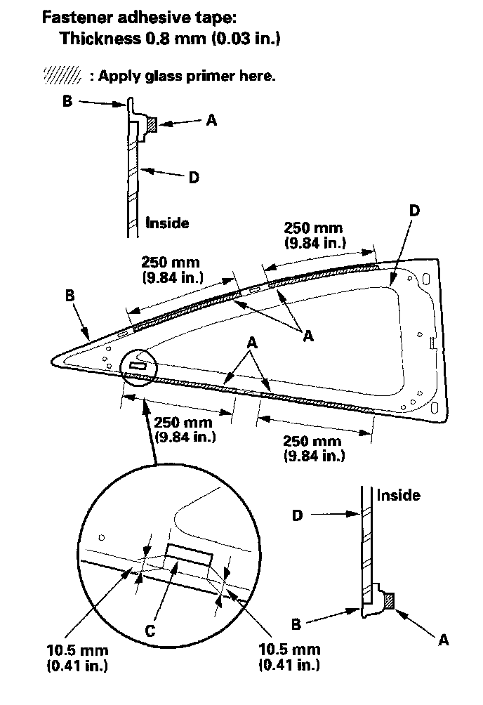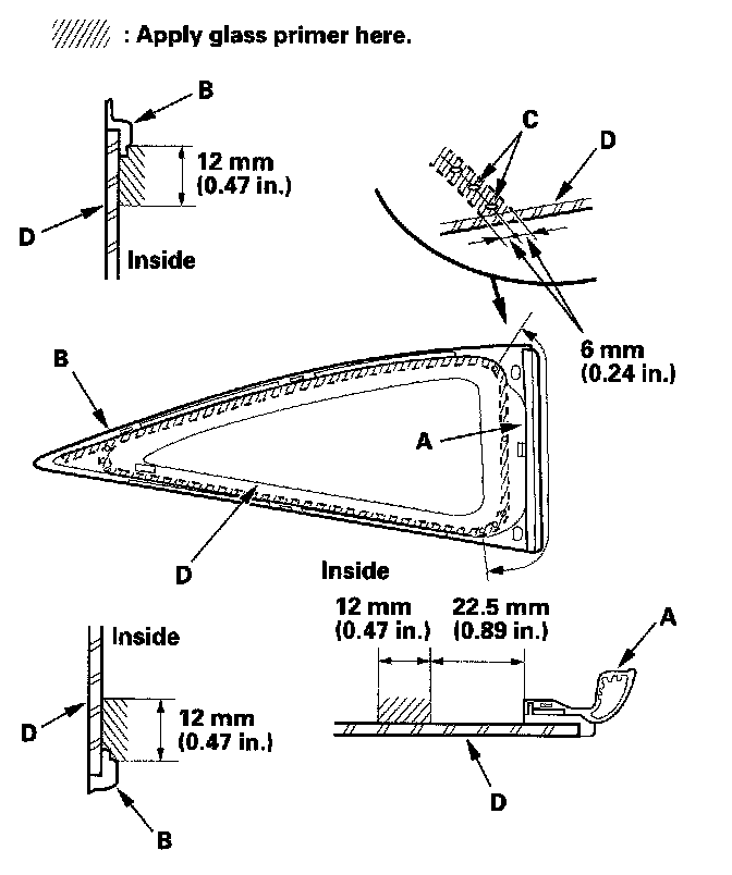 - With the printed dots (C) on the quarter glass (D) as a guide, apply the glass primer to the front portion of the quarter glass.