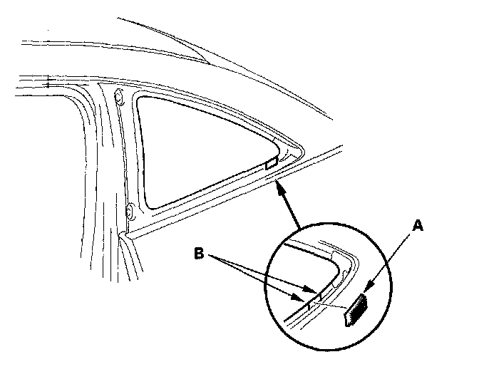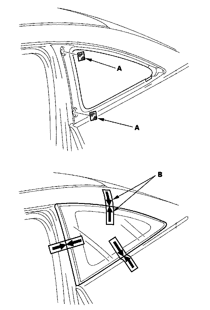 12. If the old quarter glass is to be reinstalled (and either clip is broken off the molding), seal the body holes with pieces of urethane tape (A). Then set the quarter glass upright in the opening, and make alignment marks (B) across the quarter glass and body with a grease pencil at the three points shown. Be careful not to touch the quarter glass where adhesive will be applied.