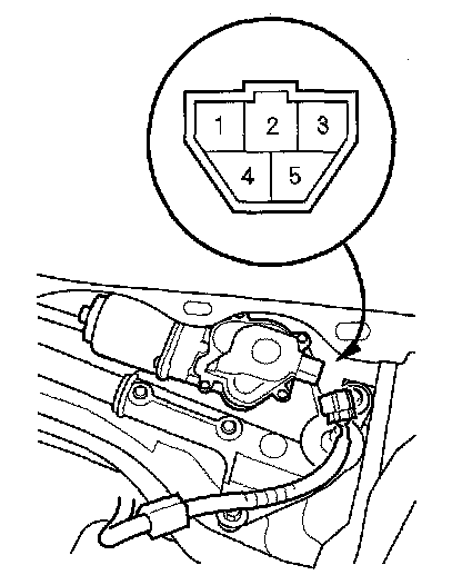 5. Test the motor by connecting battery power to the No. 2 terminal and ground the No. 5 [4] terminal of the wiper motor 5P connector. The motor should run at high speed. If the motor does not run or fails to run smoothly, replace the motor.