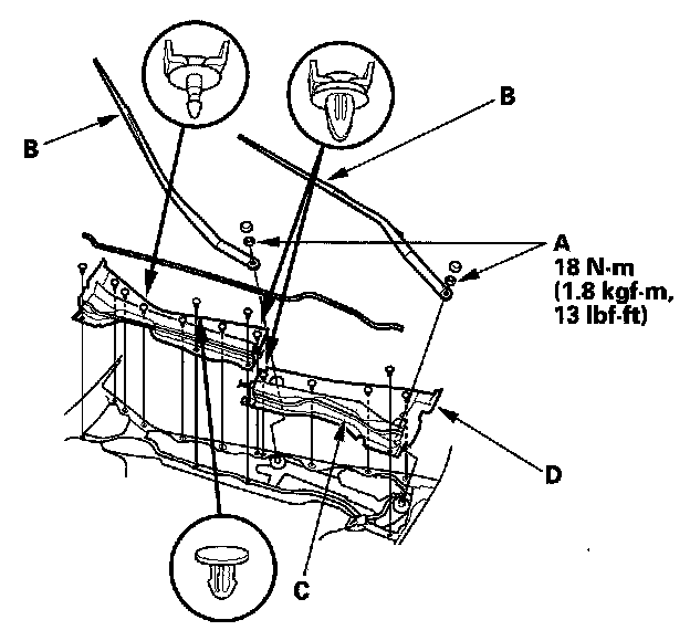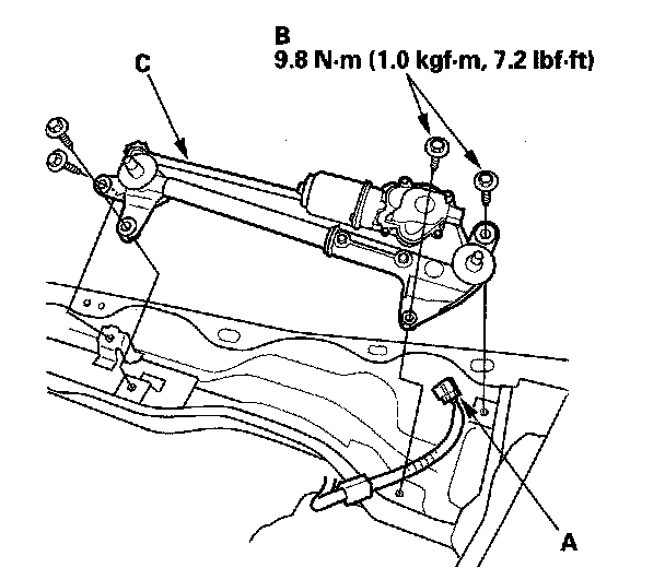 4. Remove the four bolts (B) and wiper linkage assembly (C).