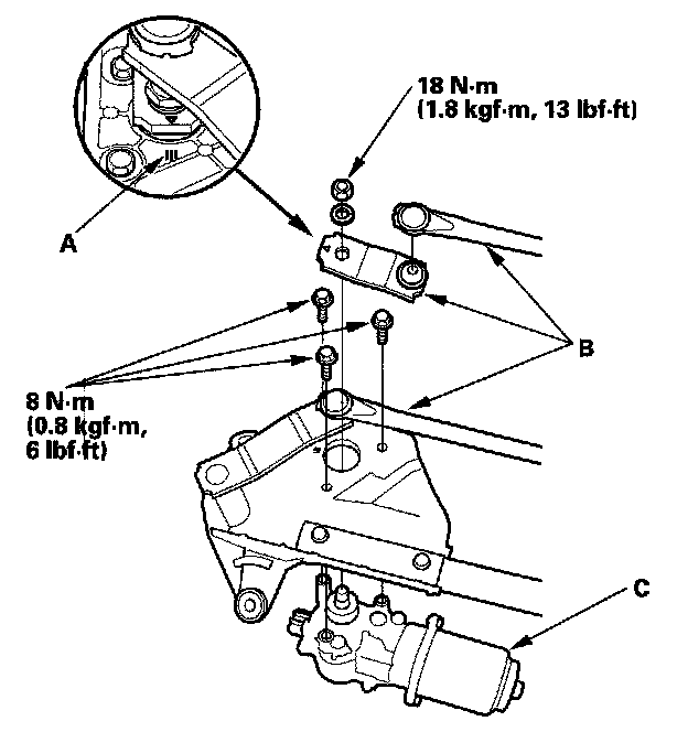 5. Scribe a line (A) across the link and windshield wiper linkage to show the original adjustment. Separate the windshield wiper linkage (B) from the wiper motor (C).