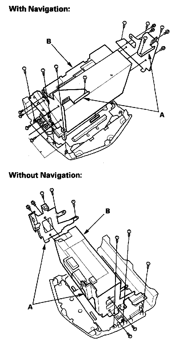 2. Remove the mounting screws and the audio brackets (A) from the audio unit (B).