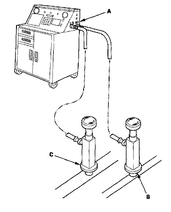 2. Connect an R-134a refrigerant recovery/recycling/charging station (A) to the high-pressure service port (B) and the low-pressure service port (C), as shown, following the equipment manufacturer's instructions.