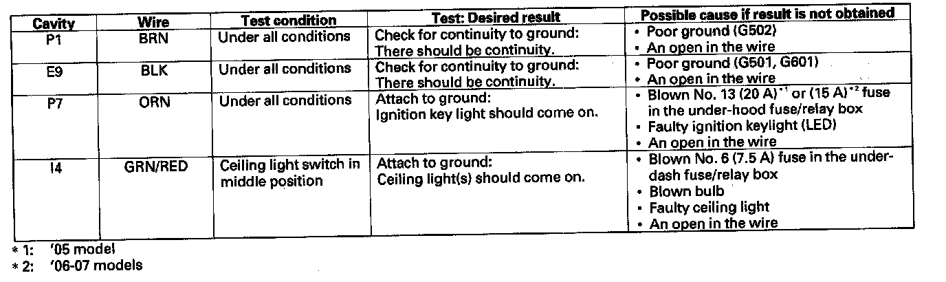 7. Turn the ignition switch to ON (II) to keep the system awake and make these input tests at the appropriate connectors on the under-dash fuse/relay box.