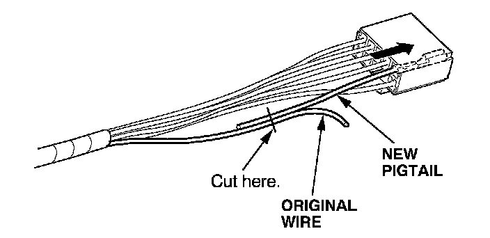 6. Lay the pigtail and the original wire side-by-side, and cut off both ends at once. If you are making more than one splice, do not cut each pigtail at the same location; the resulting "lump" of splice connectors would interfere with rewrapping the harness. Instead, cut the first pigtail close enough to the terminal so you will have room to make each remaining cut about 20 mm (3/4 inch) farther down on the next pigtail.