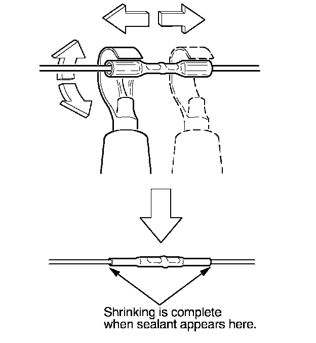 13. Plug in the heat gun, and turn it on. Start at the middle of the splice connector, and move the gun toward the ends as the tube shrinks. Apply heat evenly by rotating the curved heat spreader around the splice connector. Shrinking is complete when a small amount of sealant appears at each end of the tube.