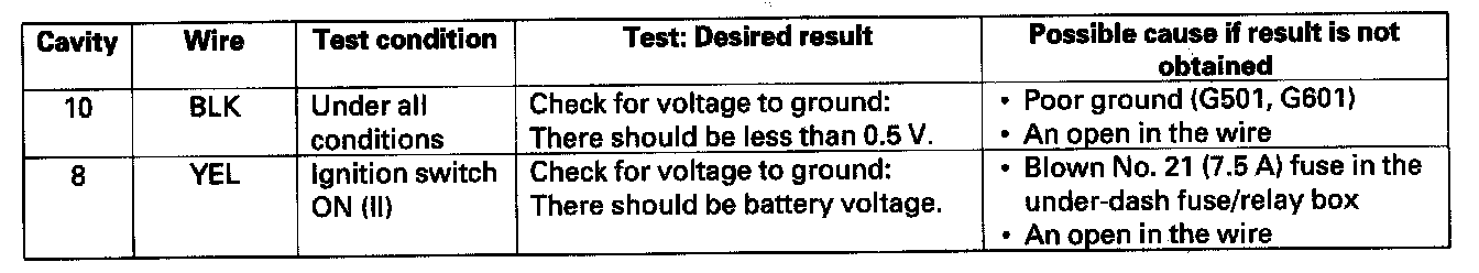 4. Reconnect the connector, and make these input tests at the connector.