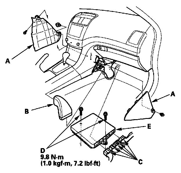 15. Remove the bolts (D), then remove the PCM (E).
