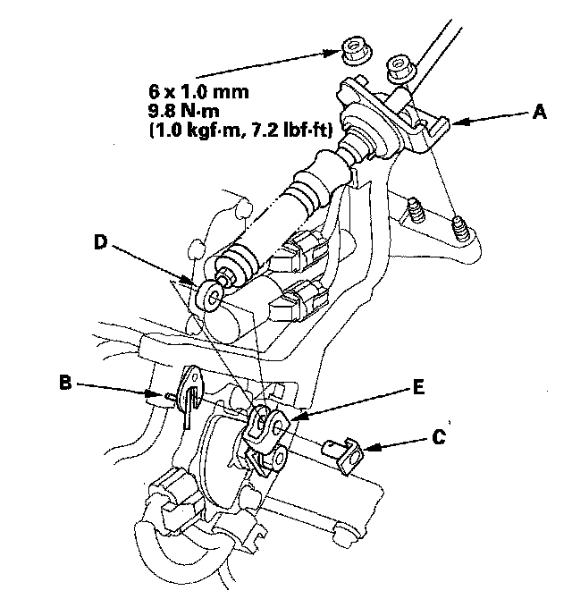 7. Remove the spring clip/washer (B) and the control pin (C), then separate the shift cable end (D) from the control lever (E).