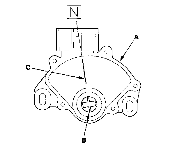12. Set the new transmission range switch (A) to the N position. The transmission range switch clicks in the N position, and the selector control shaft hole (B) aligns with the N position line (C).