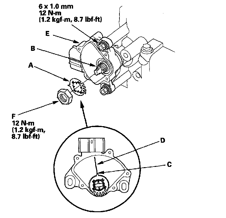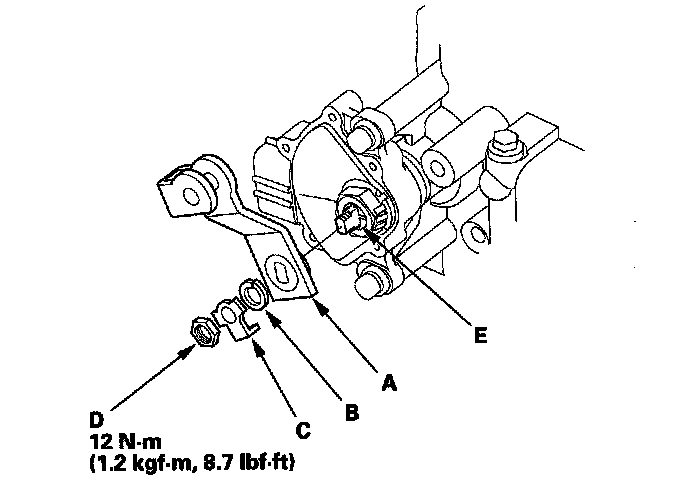 15. Install the new lock washer (A) over the selector control shaft (B) while aligning the projection (C) of the lock washer with the N positioning line (D) on the transmission range switch (E), and install the locknut (F).