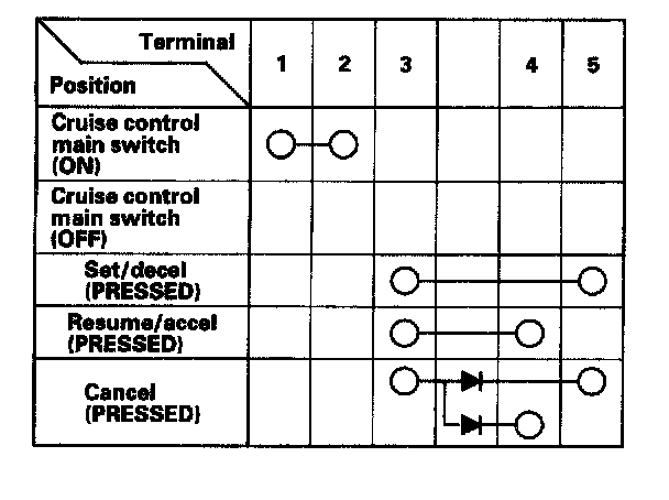 - If there is continuity, and it matches the table, but switch failure occurred on the cruise control unit input test, check and repair the wire harness on the switch circuit.