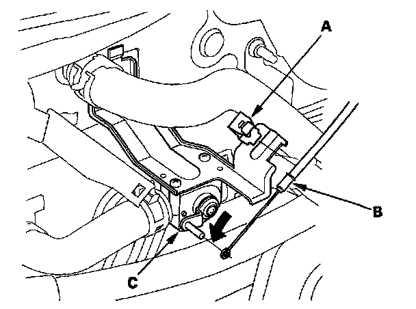 4. From under the hood, open the cable clamp (A), then disconnect the heater valve cable (B) from the heater valve arm (C). Turn the heater valve arm to the fully opened position as shown.