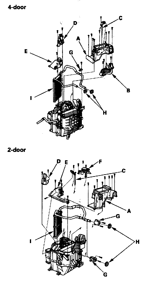 10. Remove the self-tapping screws, the evaporator temperature sensor (C) and the joint duct A, then remove the self-tapping screws and the joint duct B (4-door). Remove the self-tapping screws, then remove the passenger's heater outlet (D), and the heater core cover (E). Remove the self-tapping screws and the mode control motor (F) (2-door). Remove the self-tapping screws, the heater pipe brackets (G), the grommets (H) and carefully pull out the heater core (I) so you don't bend the inlet outlet pipes.