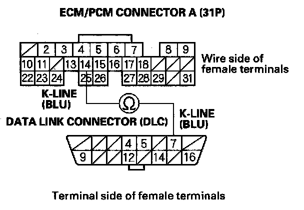 NO - Repair open in the wire between DLC terminal No. 7 and the ECM/PCM (A14). After repairing the wire, check for Temporary DTCs or DTCs with the HDS and go to the indicated DTCs troubleshooting.