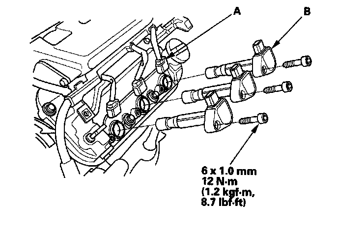 2. Disconnect the ignition coil connectors (A), then remove the front bank ignition coils (B).
