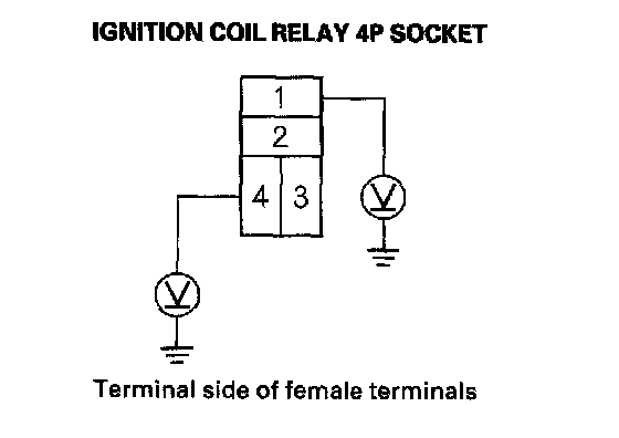 3. Measure the voltage between ignition coil relay 4P socket terminal No. 1 and body ground, then terminal No. 4 and body ground.