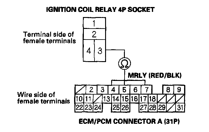 6. Check for continuity between ignition coil relay 4P socket terminal No. 3 and ECM/PCM connector terminal A5.