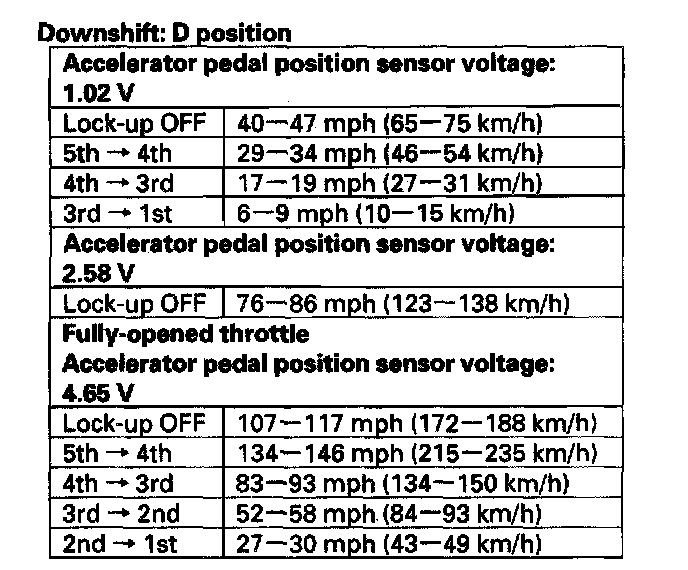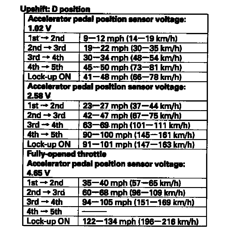 5. Test-drive the vehicle on a flat road in the D position. Check for abnormal noise and clutch slippage. While driving, check that the shift points occur at the proper speeds by monitoring the accelerator pedal position sensor voltage with the HDS and comparing your shift point speeds and voltage to those in the table. (The accelerator pedal position sensor voltage represents the throttle opening.)