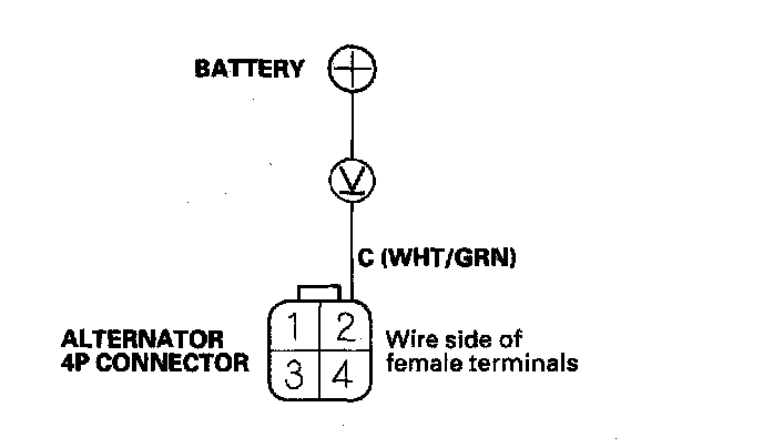 4. Measure the voltage between alternator 4P connector terminal No. 2 and the positive terminal of the battery.