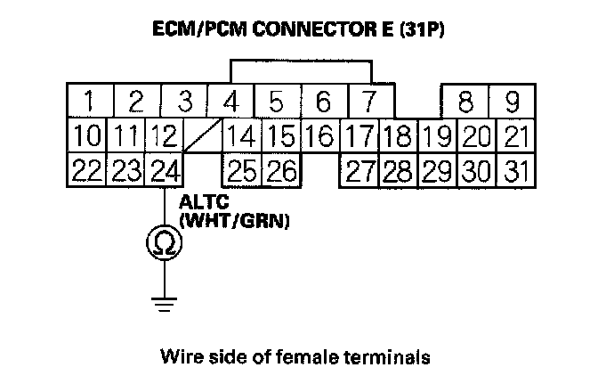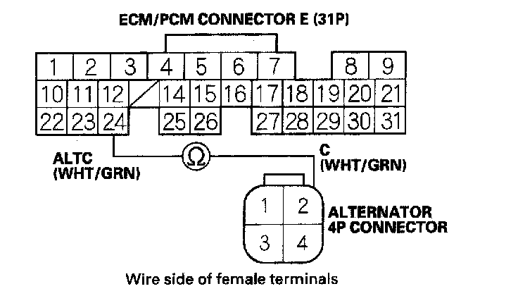 10. Check for continuity between ECM/PCM connector terminal E24 and alternator 4P connector terminal No. 2.
