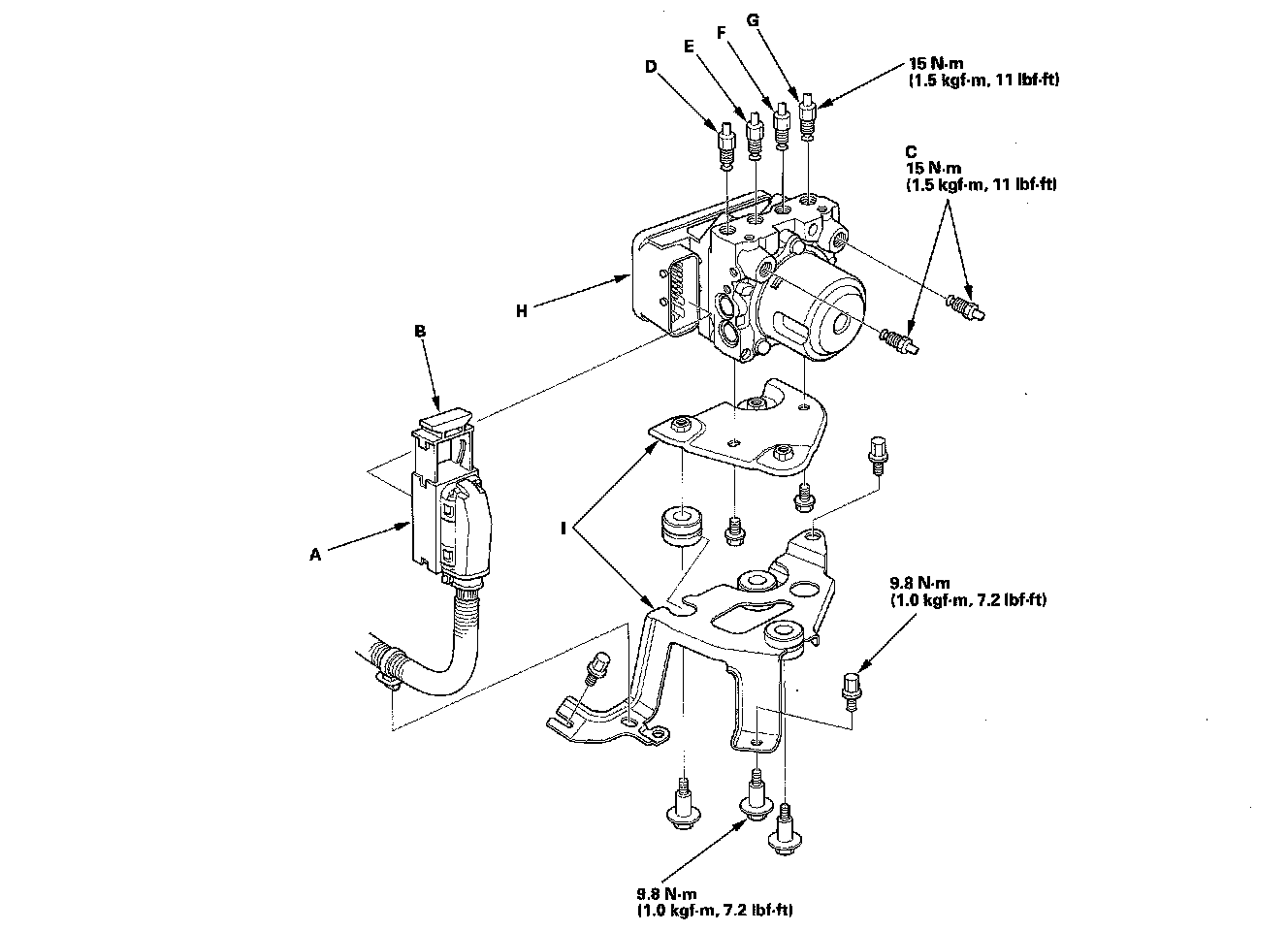 3. Remove the ABS modulator-control unit (H) with the brackets (I) from the body.