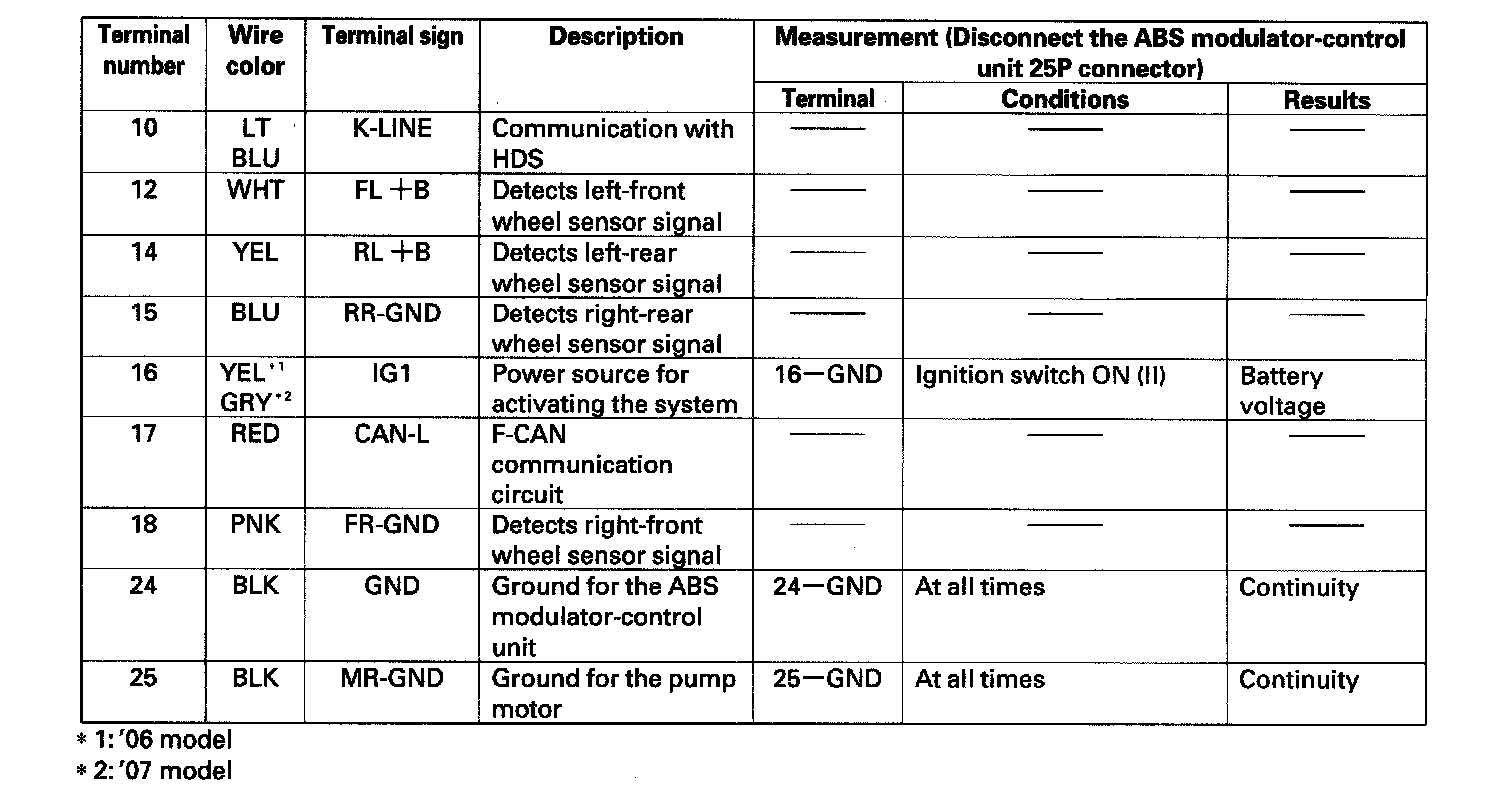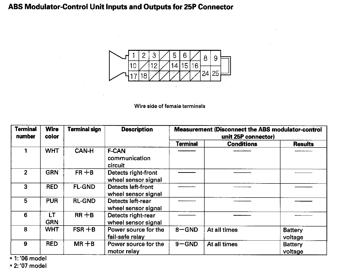 ABS Modulator-Control Unit Inputs and Outputs for 25P Connector (Part 1):