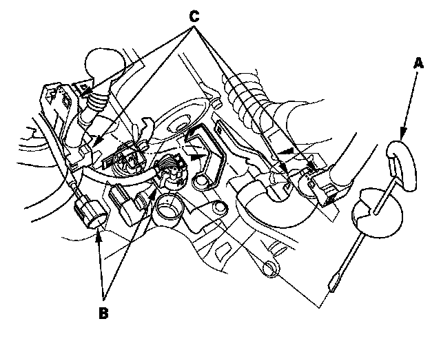 9. Remove the dipstick (A). Disconnect the connectors (B), then remove the wire harness clips (C).
