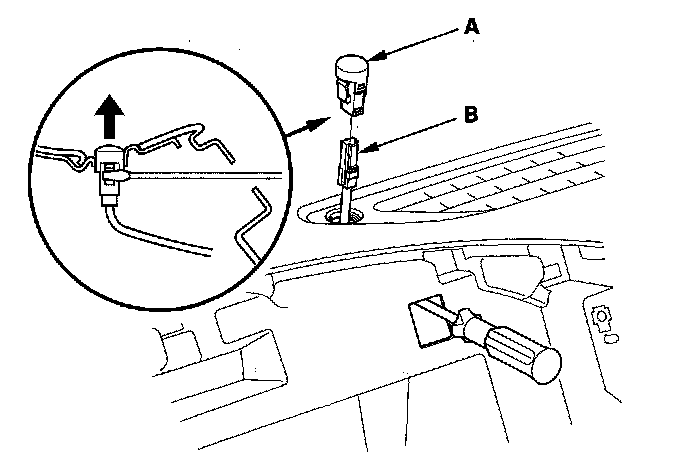 2. Remove the sunlight sensor (A) from the dashboard with a flat-tip screwdriver, then disconnect the connector (B). Be careful not to damage the sensor and the dashboard.
